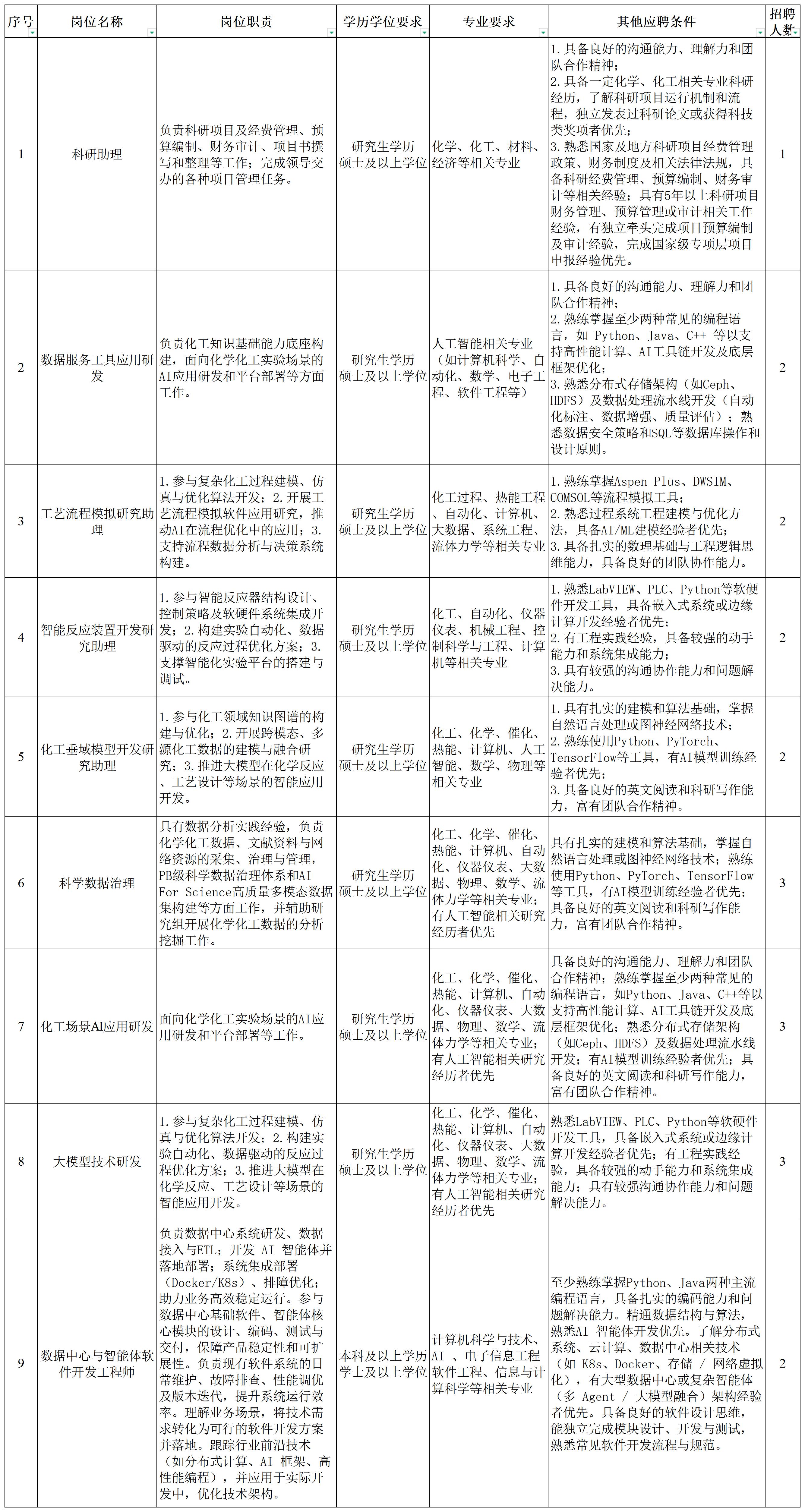 从事化工智能化、科学数据治理和AI应用研发等相关科研工作,包括但不限于下述领域:(1)垂直领域大模型与智能体技术研发;(2)复杂化工场景下的大数据分析与挖掘、化学信息学技术研究与应用;(3)PB级科学数据治理体系研发;(4)多模态数据构建、多模态大模型训练和推理;(5)人工智能赋能化学化工实验设计和流程模拟;(6)针对化学化工复杂场景的AI训练、应用平台的开发和部署;(7)人工智能赋能新型催化材料合成及催化机理研究。